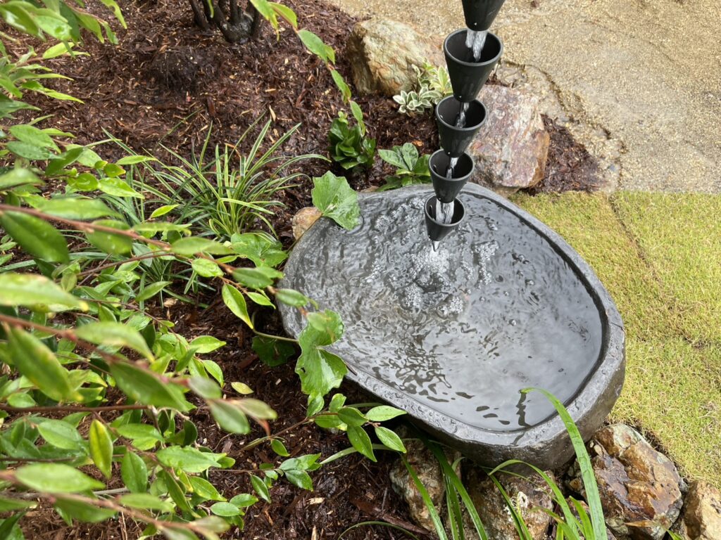 植栽の緑がいっそう鮮やかに映え、雨樋を伝う水が静かに流れ落ちる様子は、まるで自然が奏でる音楽のよう。