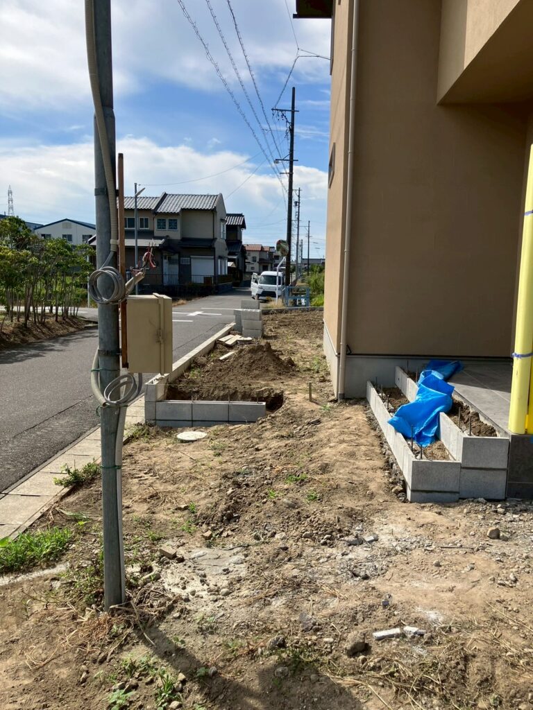 雑草の撤去が終わり、玄関前のステップの下地を作ります