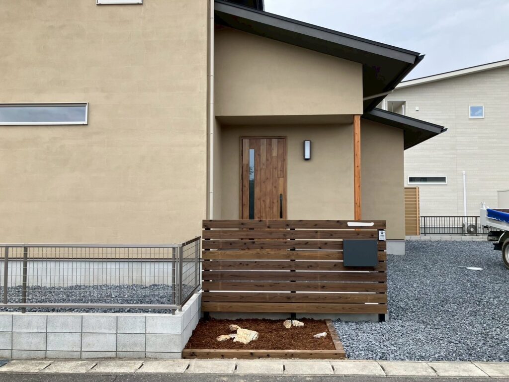 玄関前にラグウッド(天然木)の門塀を施工し、お庭のウッドデッキも完成しました