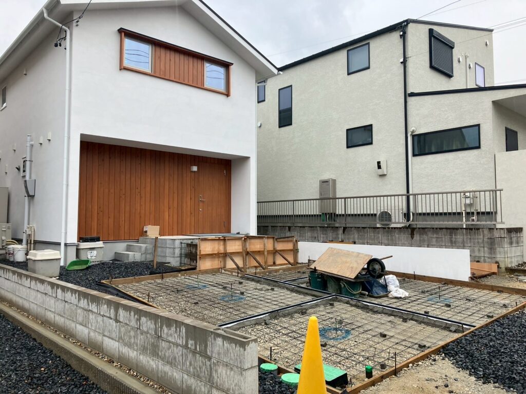 駐車場の土間コンクリートの型枠、伸縮目地を施工し、コンクリートを打設していきます