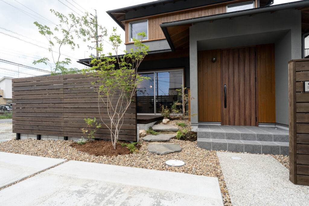 赤いポストとアクセントタイル門柱が可愛いエクステリア